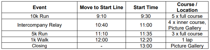 Runners / Walkers - please make your way to the start line per the following table to ensure you are ready to start on time.